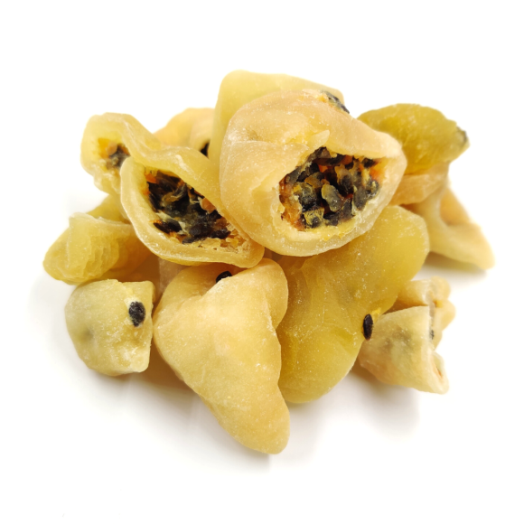 Экзотический плод маракуйя, родом из далекой Бразилии. Правда, сейчас география его выращивания расширилась в страны Юго-Восточной Азии, Австралии и Южной Африки. Это действительно интересный на вкус кисло-сладкий фрукт, кое-кому напоминает вкус киви или крыжовника. Мы предлагаем Вам попробовать маракуйю сушеную (мин.сахара), которая полна витаминами группы В, витамином А и столь необходимым человеческому организму витамином С. Для укрепления иммунитета маракуйю сушеную можно давать детям, поскольку это не только полезно, но и очень вкусно. Маракуйя высушена с добавлением минимального количества сахара только для того, чтобы получить хорошую форму и цвет, поэтому смело можете пробовать этот сухофрукт, даже если полностью отказались от сахара. А такие важные микроэлементы как железо, цинк, магний, калий, медь, фосфор, содержащиеся в сушеной маракуйи (мин. сахара) стабилизируют артериальное давление, восстановят Ваш организм после стресса.