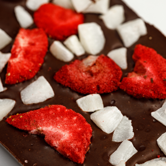 Черный шоколад с клубникой и кокосом – настоящая роскошь для вкусовых рецепторов. Каждый кусочек этого шоколада сбалансирован между глубоким интенсивным вкусом классического черного шоколада и нежными нотками сушеного кокоса и сублимированной клубники. Его текстура имеет необычную гладкость, таящую во рту, даря вам сочетание нежного и кремового вкуса со свежестью клубники и экзотическим ароматом кокоса. Шоколад черный (клубника - кокос) - это настоящее наслаждение для тех, кто любит экзотику и роскошь. Наслаждайтесь вкусом шоколада, просто растворяя его во рту и допуская, чтобы его насыщенный аромат и вкус раскрылись полностью. Используйте шоколад в качестве десерта после обеда или ужина. Просто порежьте его на кусочки и наслаждайтесь вместе с кофе или чаем. Добавьте кусочки черного шоколада в кексы, печенье или мафины для интенсивного вкуса и текстуры. Используйте тонко нарезанный шоколад в качестве украшения для мороженого, пирожных или тортов, чтобы придать экзотическому вкусу и эстетическому виду вашим блюдам. Независимо от способа, черный шоколад с клубникой и кокосом станет для Вас настоящим наслаждением.