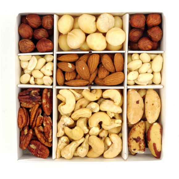 Якщо Ви хочете отримати повний комплект корисних та поживних речовин, що містяться у горіхах, замовте наш чудовий подарунковий набір сирий горішок. Адже всім відомо, що саме в сирих горіхах зберігається максимальна кількість корисних мікро- та макроелементів, які частково втрачаються під час їх просмажування. Тому сирі горішки - це саме те, що Вам потрібно. До нашого набору сирий горішок, ми додали шість видів горіхів, які задовольнять всі Ваші потреби у поживних речовинах: Пекан сирий очищений - далекий родич волоського горіха, ба навіть, зовні дуже на нього схожий. Але за смаковими властивостями дещо відрізняється. Має приємний солодкий смак та є лідером за вмістом корисних амінокислот та жирів серед горіхів. Кешью сирий - має приємний злегка трав'янистий присмак, з вершковими нотками. Дуже корисний для профілактики серцево-судинних захворювань та загального зміцнення імунітету. Абрикосова кісточка зовні схожа на мигдаль, але дещо менша за розмірами. Має особливий приємний смак, який ні з чим не порівняти. Містить в собі вітаміни групи В та речовини, які запобігають утворенню ракових клітин. Мигдаль сирий - корисний поживний горіх, що містить в собі мікро- та макроелементи необхідні в щоденному раціоні людини. Вважають горіхом довголіття. Фундук сирий неочищений - джерело вітамінів групи В, цинку, заліза. За вмістом поживних речовин може конкурувати з м'ясом та рибою. Макадамія без шкаралупи - екзотичний горіх, який не тільки наситить організм поживними речовинами, але й стане помічником у процесі схуднення. Додайте до Вашого кошика набір сирий горішок - підсильте Ваш імунітет!
