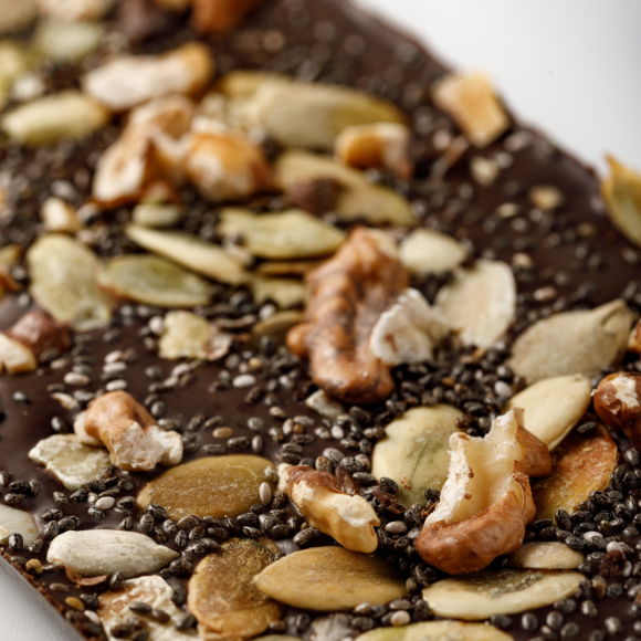 Шоколад чорний Кероб Чіа без цукру з вмістом какао-продуктів не менше 41% - це особливий вид шоколаду, що поєднує в собі корисність керобу та насіння чіа, а також багатство смаку волоських горіхів та насіння гарбуза. Какао-масло є основною складовою чорного шоколаду і відповідає за його текстуру та розкішний смак. Воно надає шоколаду гладкість та блиск, а також впливає на його поживні властивості. Кероб - це природна альтернатива какао, яка виготовляється з плодів дерева кероба. Він має солодкий, ненав'язливий смак та може бути менш гірким в порівнянні з какао. Насіння чіа - це додаткове джерело поживних речовин, таких як омега-3 жирні кислоти, білки, волокна та антиоксиданти. Насіння чіа також додає хрусткості та текстури шоколаду. Насіння гарбуза багаті на білок, жир та вітаміни. Воно має приємний горіховий смак і надає шоколаду додаткової хрусткості та аромату. Горіхи волоські - це додаткове джерело білків, жирів та мінералів, таких як магній та цинк. Шоколад чорний Кероб Чіа без цукру - це вишуканий і корисний продукт, який поєднує в собі смак та корисні властивості керобу, насіння чіа, горіхів волоських та гарбуза. Це може бути чудовим додатком до вашого раціону та смаковою насолодою для любителів шоколаду.
