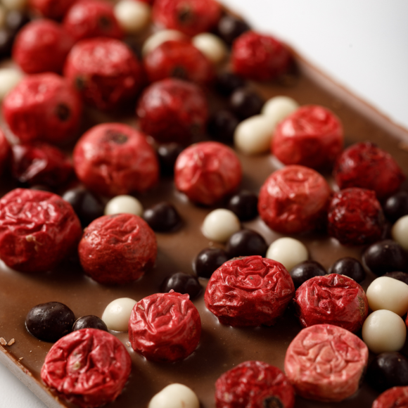 Шоколад молочний (бабл) - це солодкий десерт, який поєднує в собі молочний шоколад з хрусткими злаковими шариками та сублімованою червоною смородиною. Натуральне какао терте надає шоколаду глибокий аромат та насичений кавовий смак. Какао-масло забезпечує шоколаду гладку текстуру та розкішний блиск. Цукор додає солодкості до шоколаду та балансує гіркоту какао. Сухе цільне молоко і молочний жир надають шоколаду кремовий смак та багатий молочний аромат. Сироватний порошок може бути доданий для підсилення молочного смаку та текстури. Соевый лецитин використовується як емульгатор, який допомагає змішати інгредієнти та забезпечити гладку консистенцію шоколаду. Екстракт ванілі додає ніжний аромат та солодкі нотки до шоколаду. Злакові кульки надають шоколаду бабл додаткову текстуру та хрусткість, а також різноманітність смаків. Сублімована порічка надає шоколаду відтінок та ніжний аромат червоної ягоди. Шоколад молочний (бабл) з цими складовими обіцяє бути чудовим джерелом задоволення з багатим молочним смаком, додатком хрустких шариків і фруктовими нотками порічки.